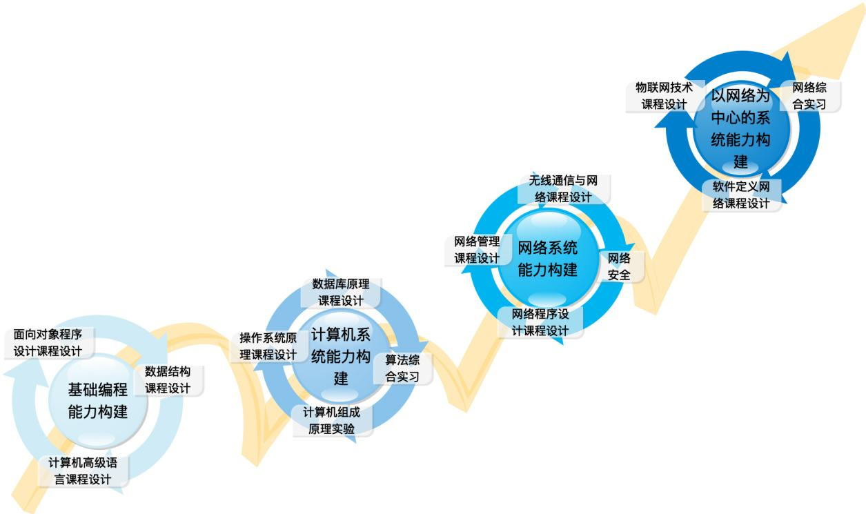 主要实践性教学环节:计算机高级语言课程设计、面向对象程序设计课程设计、数据结构课程设计、计算机组成原理课程设计、操作系统课程设计、算法综合实习、网络程序设计课程设计、数据库原理课程设计、网络管理课程设计、未来网络技术课程设计、无线通信与网络课程设计、网络安全课程设计、智慧物联网技术课程设计、网络综合实践。