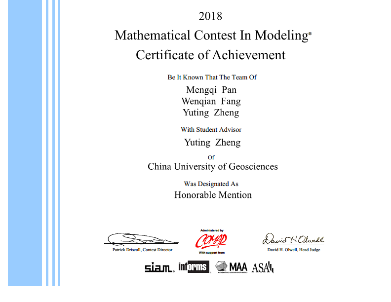 在与众多名校参赛队的激烈角逐中,公司英国365集团网站三名同学李贝(2016级硕士计算机科学与技术专业)、乔璐楠(2016级硕士计算机科学与技术专业)、王利宇(2017级硕士计算机科学与技术专业)获得了该项赛事一等奖(Meritorious Winner)。另外,英国365集团网站潘孟琦(2016级硕士计算机科学与技术专业)、数理公司方文倩(2017级硕士信号处理与智能计算)、英国365集团网站郑雨婷(2017级硕士计算机科学与技术专业)三位同学获该项赛事二等奖(Honorable Mention)。