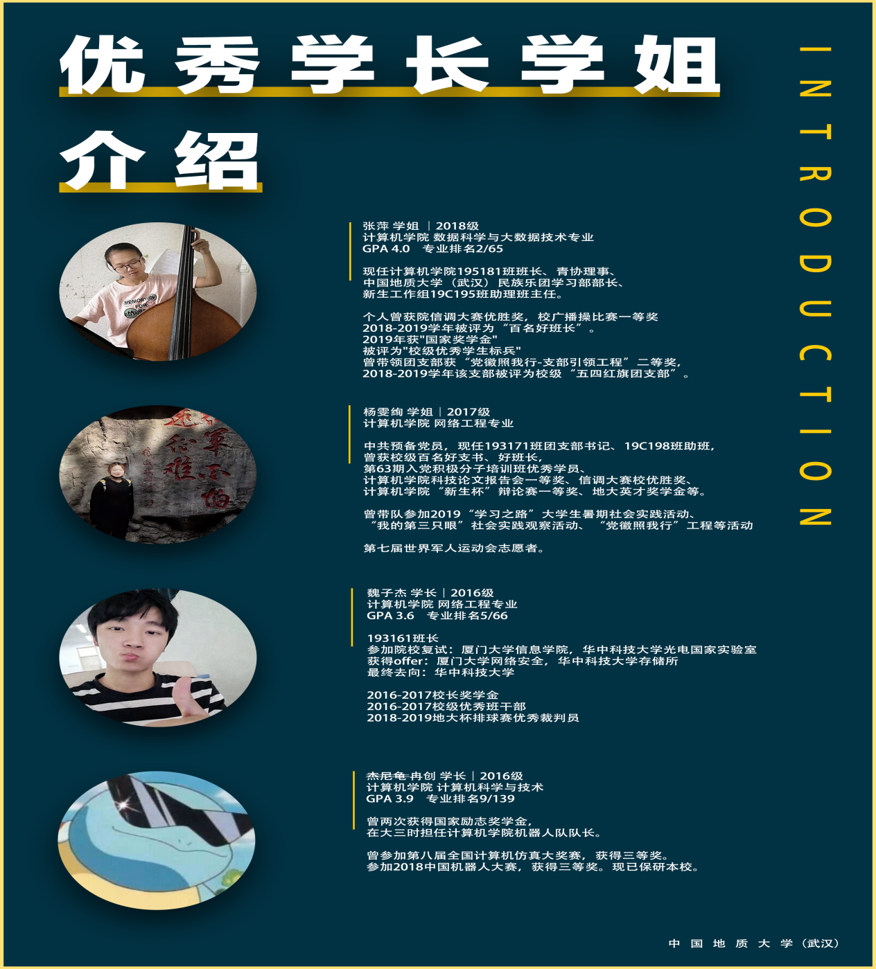 最后一位是16级计算机科学与技术专业冉创学长,冉创学长学分绩点达到3.9,专业排名第九,曾两次获得国家励志奖学金,在大三时担任英国365集团网站机器人队队长;曾参加第八届全国计算机仿真大奖赛,获得三等奖。参加2018全国机器人大赛获得三等奖,现已保研本校。