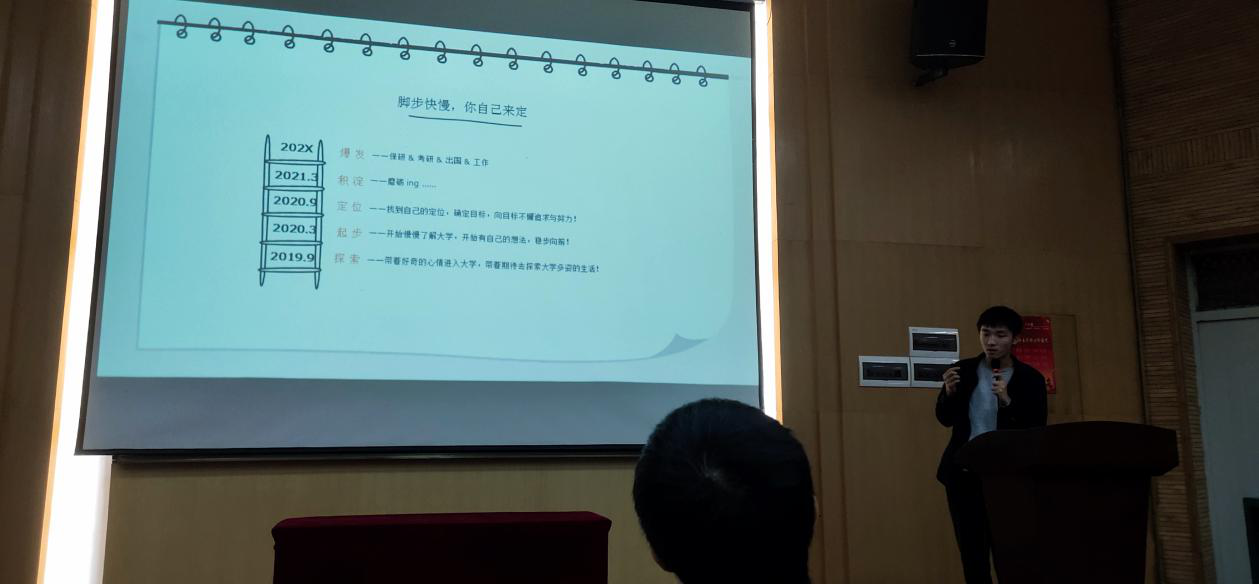 魏学长简洁凝练的宣讲介绍了保研、考研、工作的选择取舍。给我们大学四年大致的阶段性计划提出了建议。并介绍了考研保研所需要做的准备工作。如给了我们选择通识课的建议等。告诉我们班委和员工工作组织能做的工作和应该提升的能力,鼓励我们多出去走走增长见识。