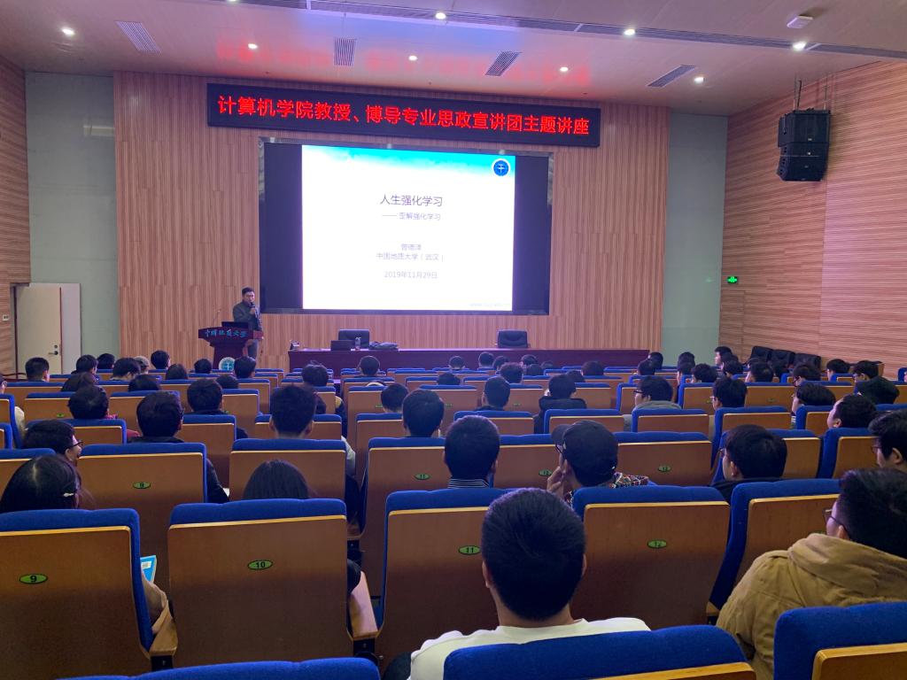 讲座正式开始,曾德泽教授以自己的研究领域,强化学习算法为例,深入浅出地介绍了强化学习的基本原理和步骤,并由此引申出“人生强化学习”的主题。接着,他类比强化学习的求解过程,将个人成长过程中所需具备的品质和素养总结为28个字:以史为镜、目光长远、日夜兼程、敢于挑战、百折不挠、广纳谏言、终身学习,并通过一个个生动的实例,逐一解读其中蕴含的人生哲理,以及对同学们个人发展和进步的现实意义。通过本次讲座,同学们在拓宽学术科研视野的同时,也对“人生强化学习”这一主题的思想内涵有了更加深刻的理解和思考。