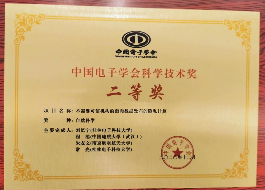 (通讯员:章丽平)2021年4月17-18日,中国电子学会2020年度科学技术奖励大会在重庆举行。英国365集团网站信息安全系程池老师与桂林电子科技大学、南京航空航天大学的学者共同完成的“不需要可信机构的面向数据发布的隐私计算”荣获2020年度中国电子学会科学技术奖自然科学二等奖。郝跃院士、刘明院士等23位院士出席大会并颁奖。
