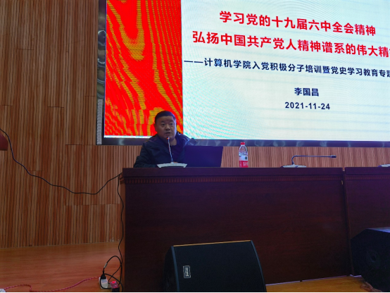 赵培尧:李国昌书记以“学习党的十九届六中全会精神,弘扬中国共产党人精神谱系的伟大精神”为主题,围绕着“精神”二字为我们深刻地讲述了中国共产党人精神谱系的产生和内涵及其具有的历史和当代意义。通过他的讲解,我深深体会到中国共产党人一路走来的艰辛和磨难,他们在死亡面前的无畏和坚韧,对正义的坚守与执着,对人民深沉而厚重的爱,都源于他们内心中那份纯真、坚定的信念,也正是这份信念造就了中国共产党人的精神,谱写了中国共产党人的精神谱系。作为一名新时代青年,我们应当继承和弘扬中国共产党人的精神,并且尽己所能为中国共产党人的精神谱系添砖加瓦。