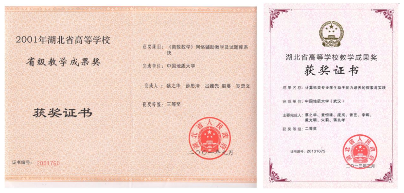 自1986年任教以来,蔡之华老师长期主讲本科生课程和研究生课程,包括数据结构、离散数学、机器学习、计算机应用数学,承担过本科生学务指导老师和班主任工作。他任班主任的班级曾荣获“湖北省优秀班集体”。他非常重视课堂教学,常对员工说:“高效的课堂学习是培养学科兴趣的动力。”蔡老师“组合数学”(员工们习惯称呼,实为“计算机应用数学”)经常板书推导公式,给员工留下了深刻印象。他带领教学团队,积极探索新教学模式,延展课堂教学空域和时域,优化教学交互过程,提升教学质量。他带领的教研团队多次获得湖北省、公司教学成果奖,主持的教研项目获湖北省人民政府二、三等奖各1项,公开发表教研论文5篇,编写教材3部,其中一部获得中国地质大学普通高校优秀教材一等奖。他是国家一流本科专业“计算机科学与技术”建设点的负责人。