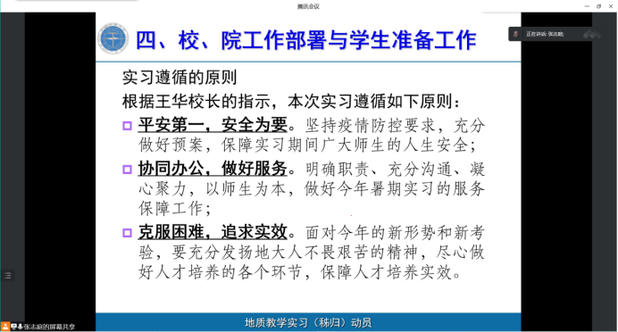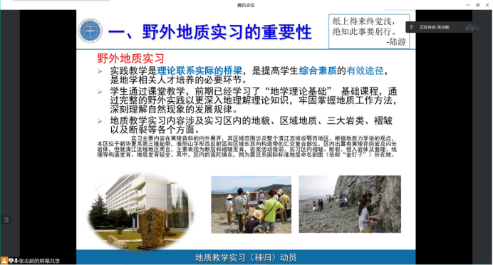 张志庭老师重点介绍野外地质实习的重要性、实习内容、总体安排和校、院工作部署与前期准备工作,并对秭归实习站具体情况、教育管理要求、理论知识学习要求等内容作详细介绍,着重强调野外地质实习的注意事项,同时提醒参与实习的员工一切行动听指挥,严格遵守实习纪律。