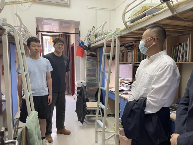 唐忠阳一行首先查看了老兵宿舍的住宿条件,对宿舍的内务卫生提出了表扬,表示老员工的内务卫生是老师们都关心的问题,希望同学们继续保持良好的作风,同时带动周围其他同学形成良好习惯。唐忠阳仔细询问了每一位同学的职业规划,并对大家继续深造和考公的规划进行了深入了解。最后勉励同学们要继续保持退伍军人的志气和本色,不管走到哪都不要忘记“根在地大”,踔厉奋发,为祖国发展贡献地大力量!