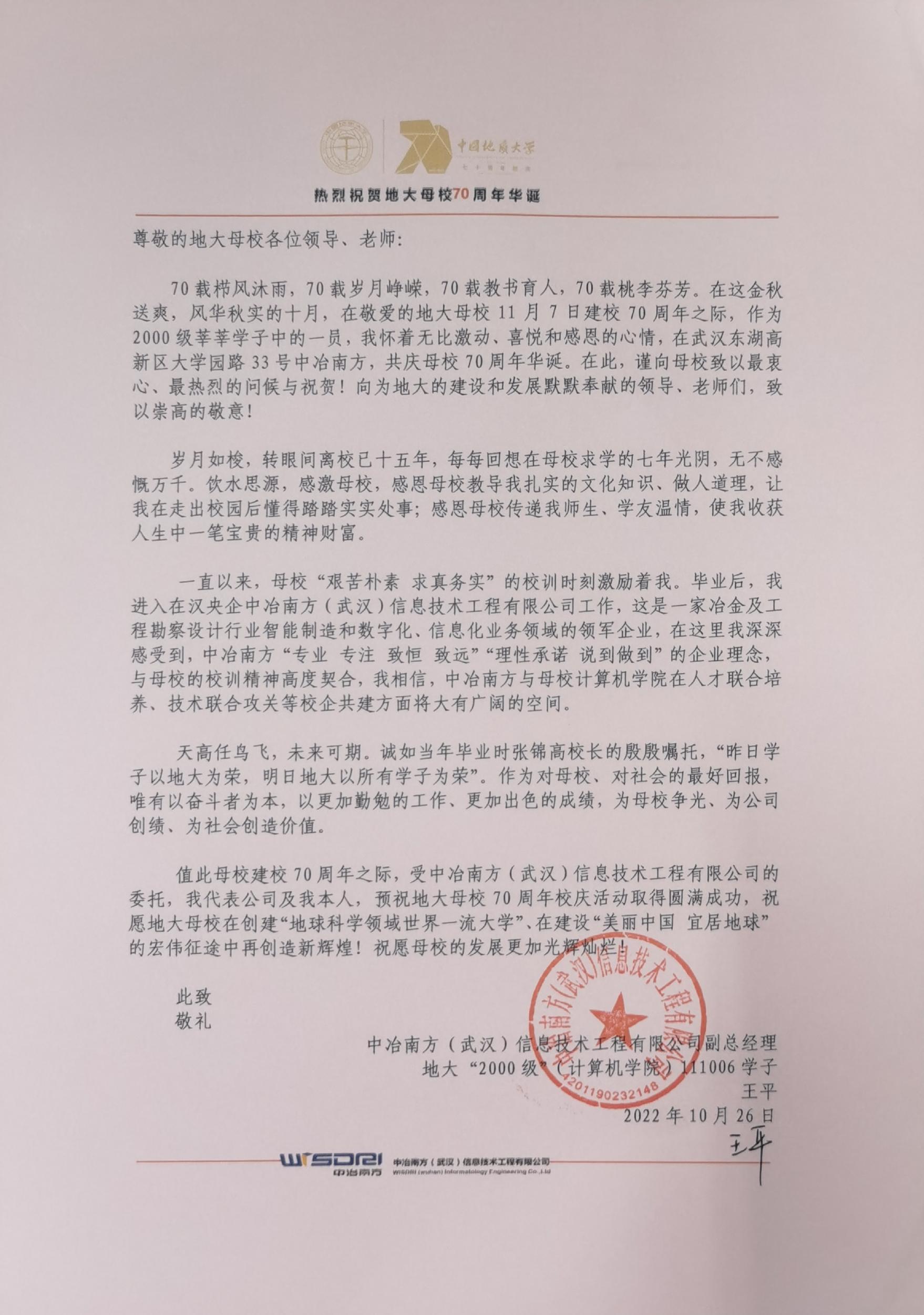 2000级员工王平向母校70周年华诞发来贺信