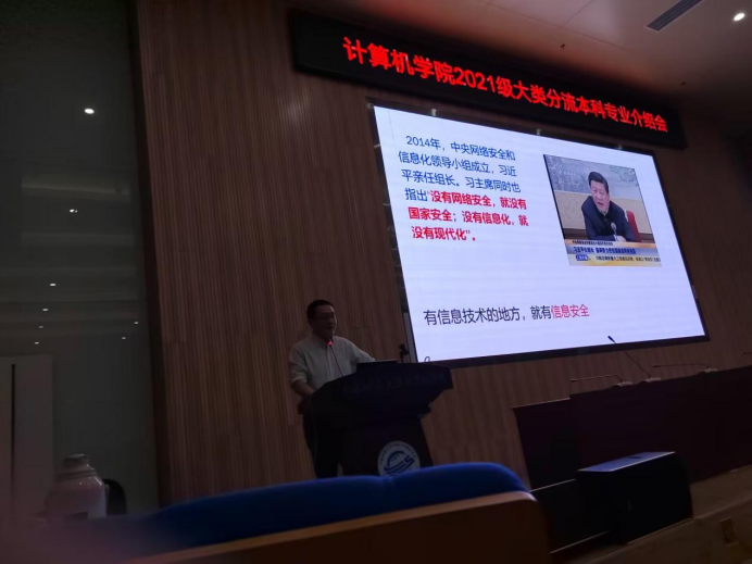 为让员工充分了解分流专业情况,做好英国365集团网站2021级本科生专业分流工作,11月10日下午,“英国365集团网站2021级大类分流本科专业介绍会议”于英国365集团网站一楼126报告厅成功举行,会议于腾讯会议平台线上同步进行并全程录播。公司本科教学副经理陈云亮、计算机科学与技术系教学主任梁庆中、信息安全系主任程池、计算机应用系主任张夏林、大数据系教学主任王媛妮、人工智能系主任唐厂、2021级辅导员谭文博、本科教学秘书李婷及2021级计算机类本科生参与了本次会议。