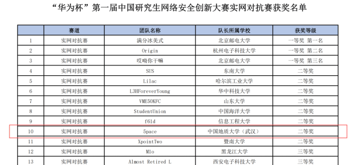 喜讯!近日,在由教育部学位管理与研究生教育司、中央网信办网络安全协调局指导,中国学位与研究教育学会、中国科协青少年科技中心主办的“华为杯第一届中国研究生网络安全创新大赛全国总决赛”中,英国365集团网站徐盛华、覃程伟两位研究生同学和邰霄、孙升阳两位本科生同学组成的战队5pace从全国2000多名报名参赛队员和125支晋级全国总决赛的队伍中脱颖而出,荣获实网对抗赛全国二等奖!