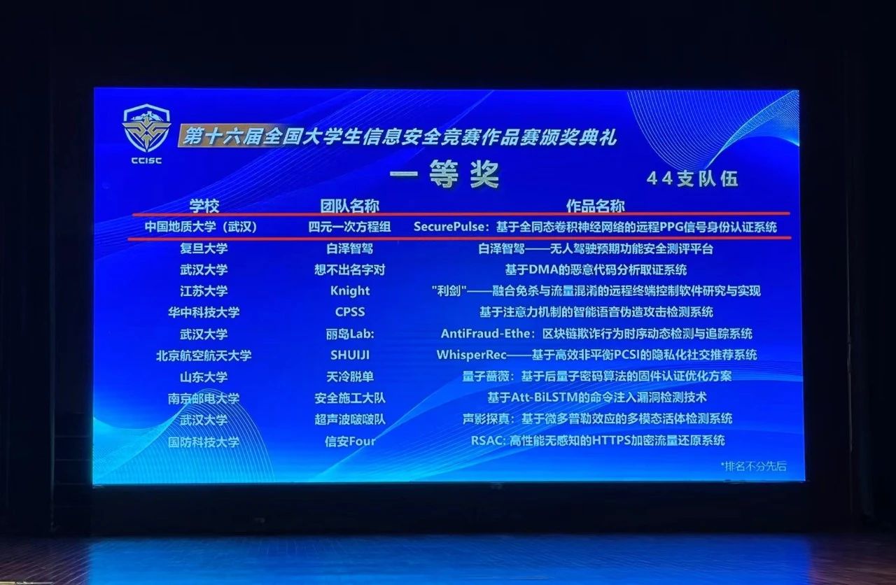 第十六届全国老员工信息安全竞赛落下帷幕,四元一次方程组战队在众多双一流高校的队伍中脱颖而出,“SecurePulse:基于全同态卷积神经网络的远程PPG信号身份认证系统”斩获全国一等奖!