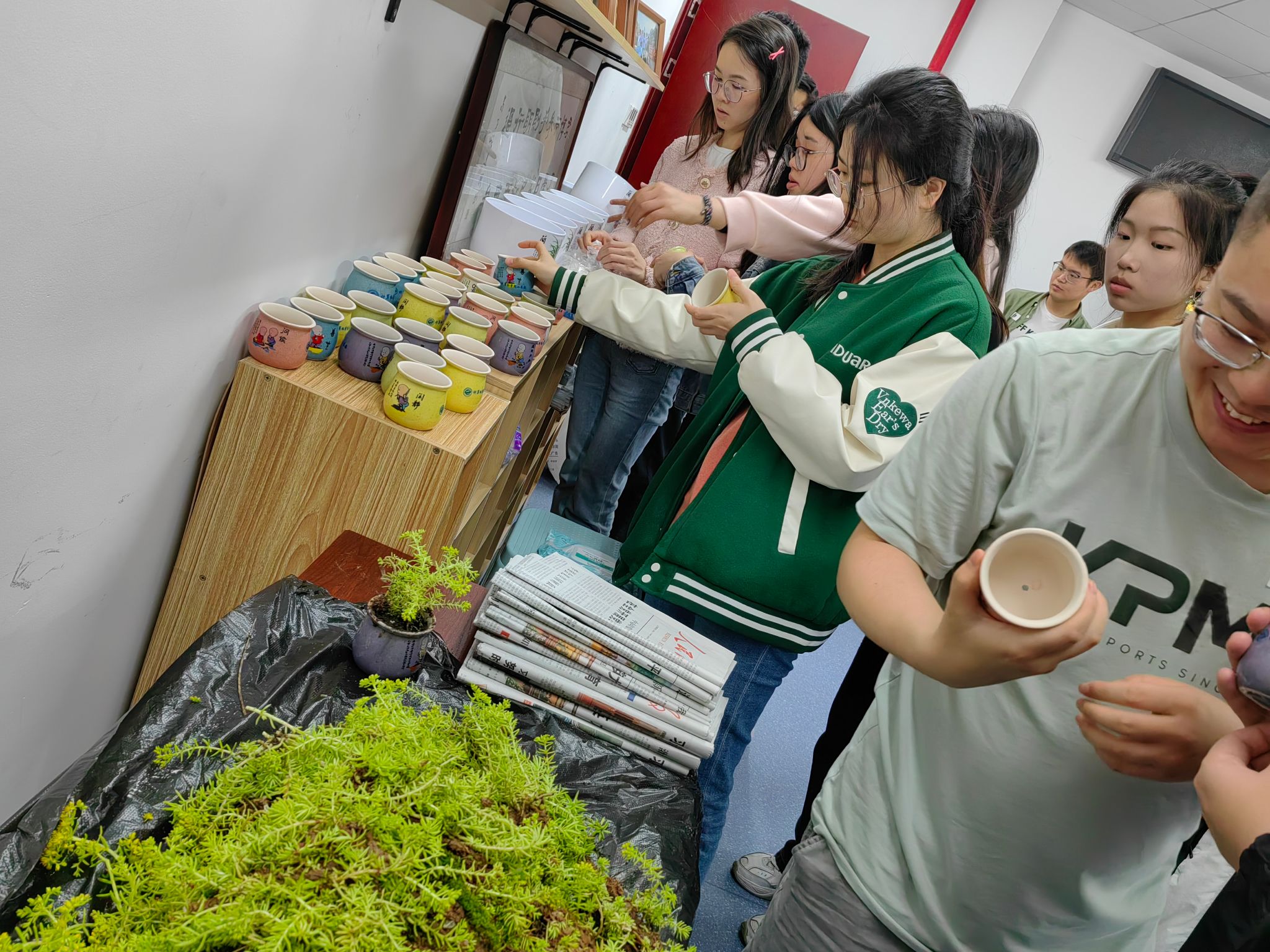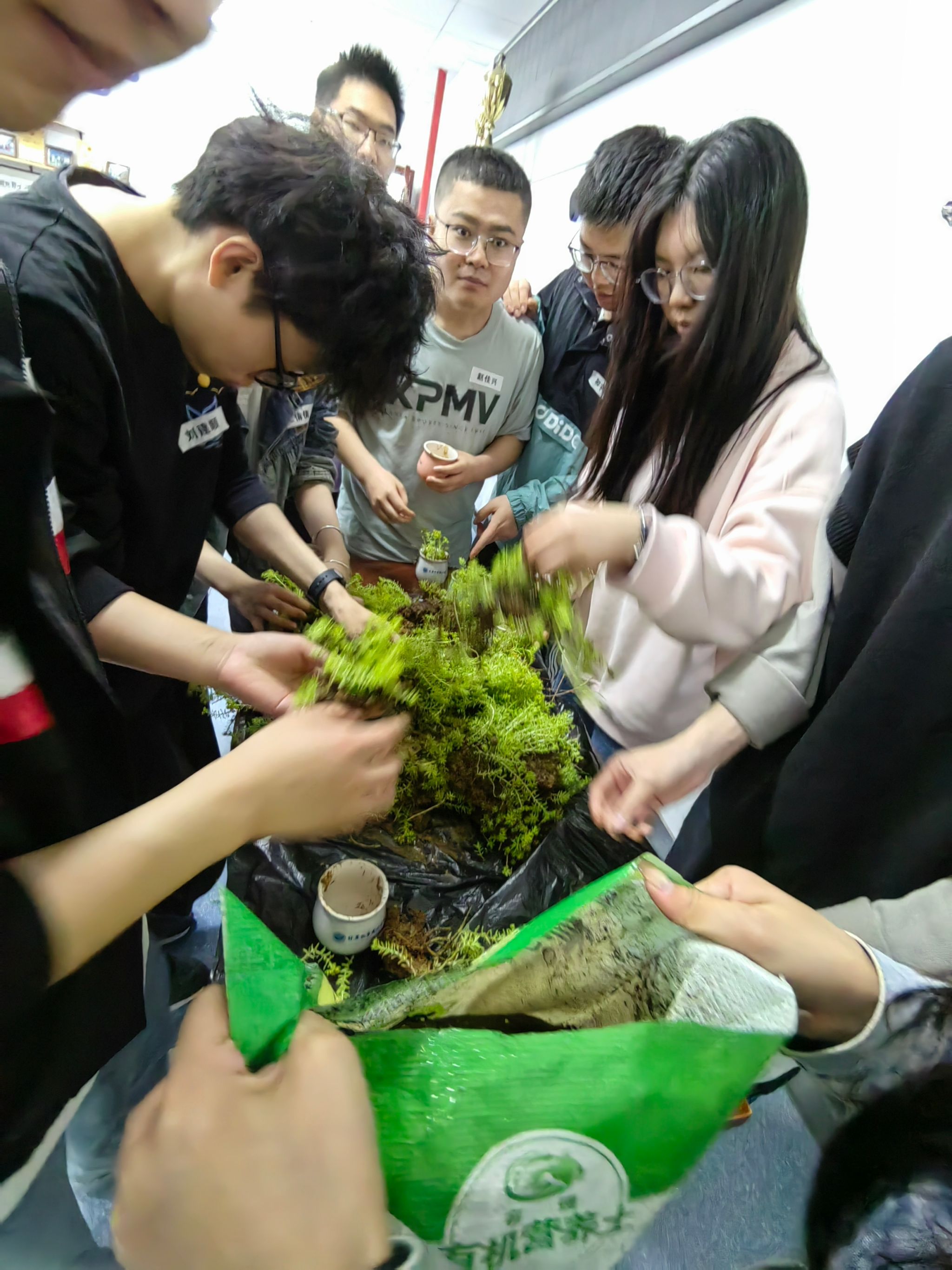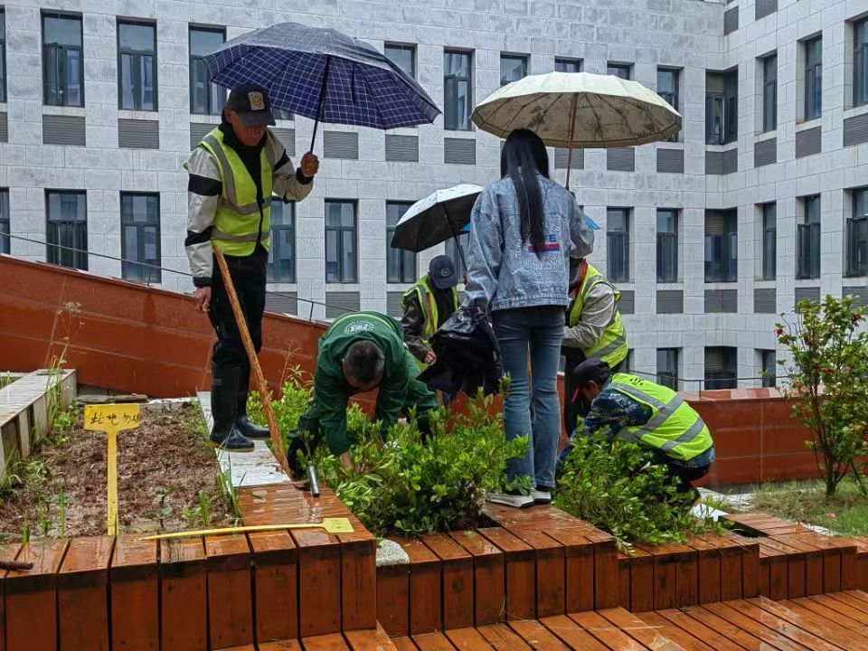 劳动理论学习后,大家来到公司三楼平台,干劲十足的动起手来,气氛融洽且热烈。同学们互相配合,挖树苗、拔小草、铲青苔、洗容器、种植物,在雨中体会劳动的乐趣,在实践中体会种植的快乐。