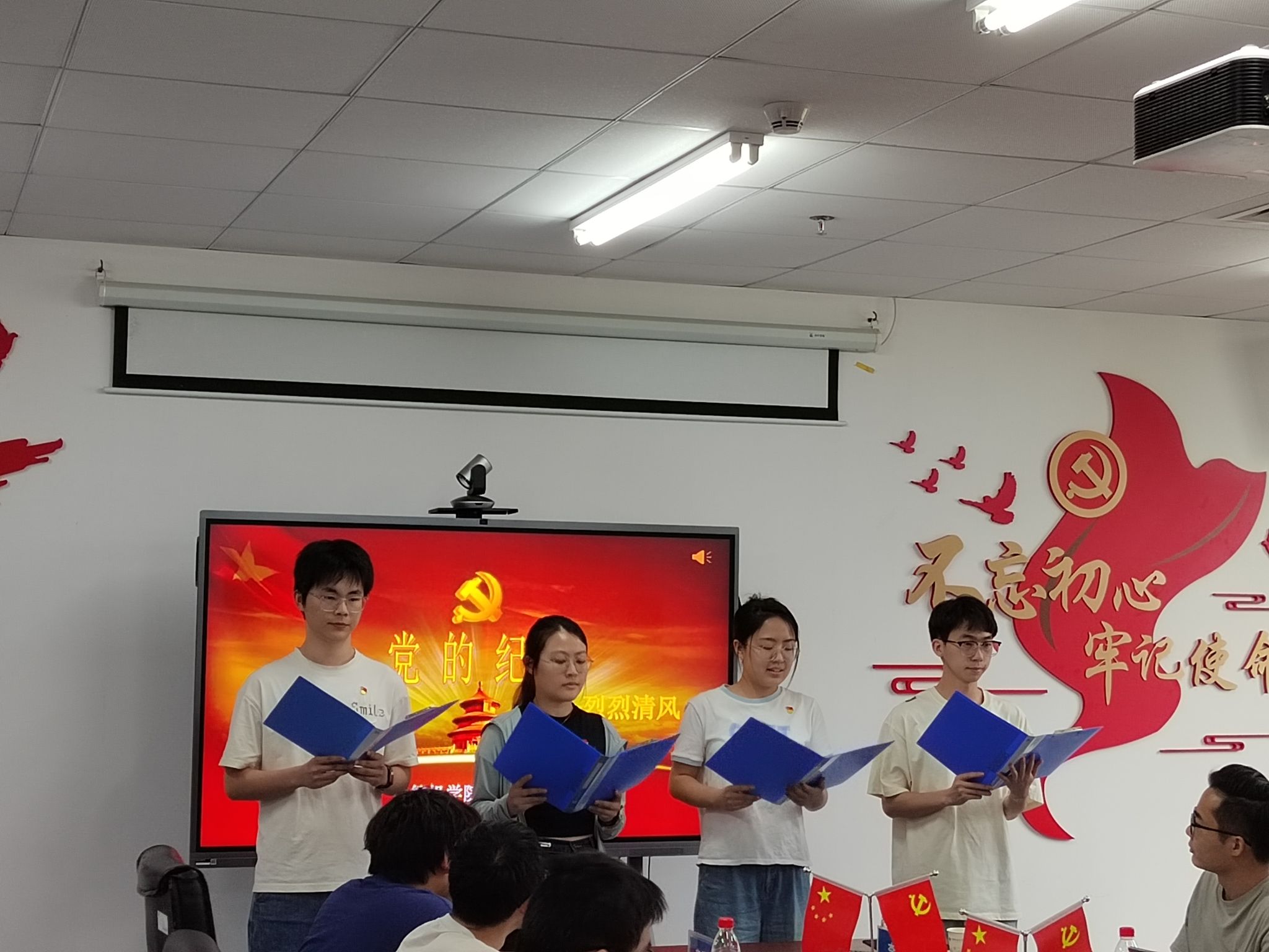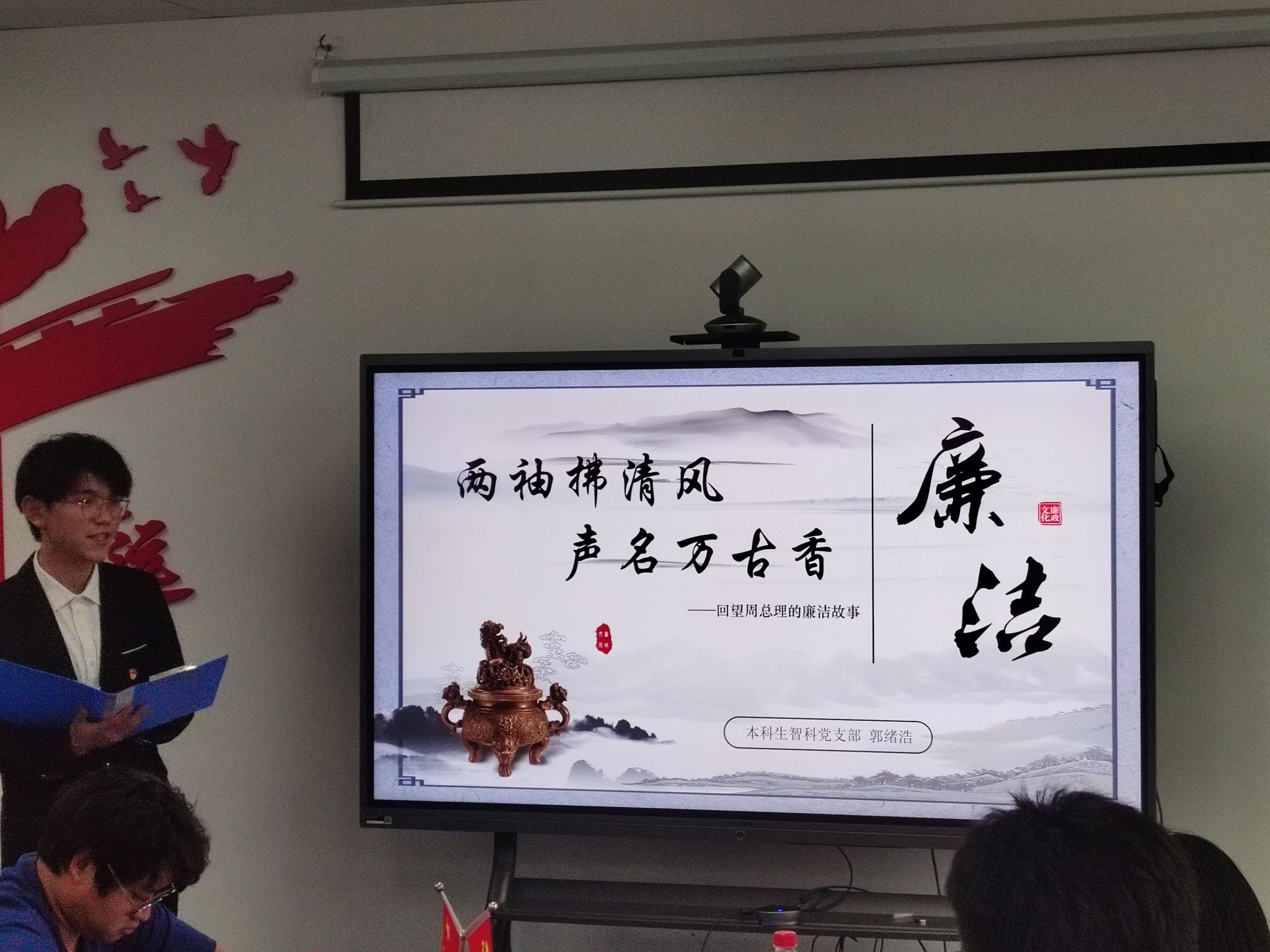 本科生空信党支部多名成员进行了诗歌朗诵,以“党的纪律:烈烈清风”为题,声情并茂地展现出对党廉政建设的歌颂。本科生智科党支部郭绪浩以周恩来廉洁奉公、严以律己的故事,让人深入了解中国共产党的历史、思想和精神传承。电子信息第二党支部潘灿也讲述了郭明义的故事来展现廉洁奉公和无私奉献精神。本科生计科第一党支部王诗敏以延安廉政的故事,展现党对于推动廉政反腐的必要与决心。电子信息第一党支部胡长浩以长征时在艰难困苦中取得胜利,体现出铁纪的重要性。