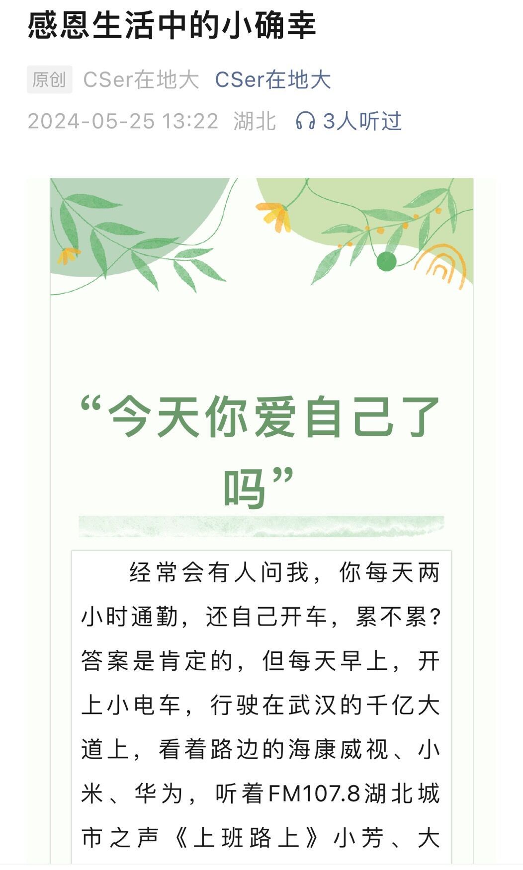 5·25全国老员工心理健康日当天,公司官方公众号“CSer在地大”发布了《感恩生活中的小确幸》,学工组全体老师为同学们送上祝福与期许,鼓励大家在生活中发现爱、感受爱、传递爱,学会享受生活中的小确幸,也祝愿CSer能在英国365集团网站感受到更多细碎而确切的幸福。