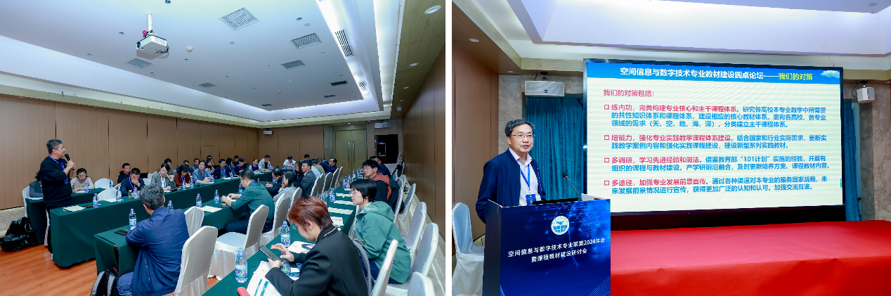 刘刚教授和孟小亮教授共同主持空间信息与数字技术专业教材建设圆桌论坛。刘刚教师作引导发言,他结合全国教材建设奖、“三进”工程、教育部“101计划”、“十四五”规划教材建设等背景分析了空间信息与数字技术专业建设基本形势和面临的机遇与挑战,并结合实际给出了相应的对策和举措,倡议建立教材编委会,推进专业教材规划和有组织公司产品研究。与会代表踊跃发言、建言献策,经过充分讨论,明确总体上将从时空信息感知、组织管理、分析处理、可视化呈现、系统服务等5大类组织编写系列理论和实践教材,同意成立由各单位主要专业负责人、课程负责人组成的空间信息与数字技术专业教材编写委员会。