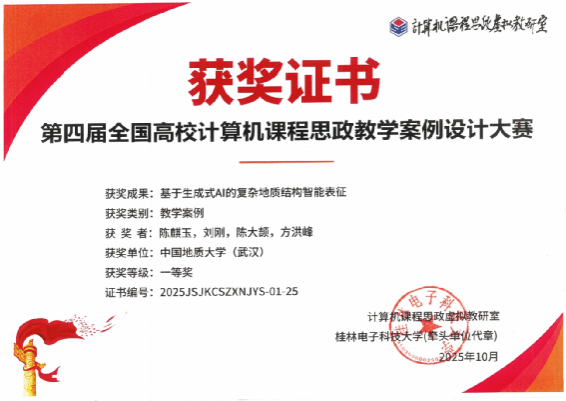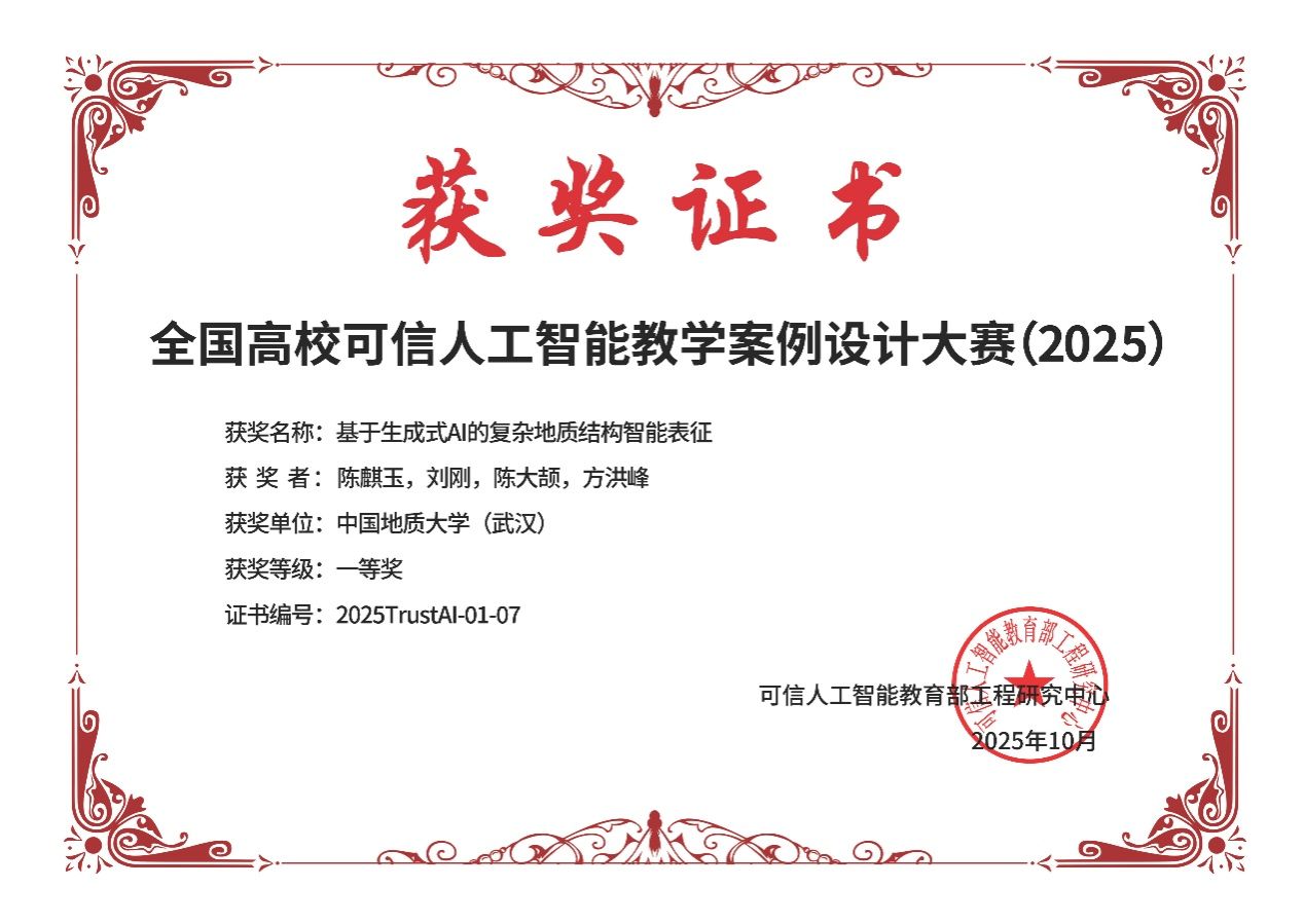 在公司党政指导与支持下,陈麒玉、刘刚、陈大颉、方洪峰完成的《基于生成式AI的复杂地质结构智能表征》和彭雷、戴光明、王茂才、宋志明、陈晓宇、武云完成的《面向深空探测轨道设计的差分演化算法》荣获一等奖,其中前者还同时获得全国高校可信人工智能教学案例设计大赛一等奖。邱芹军、田苗、陶留锋、吴麒瑞、刘郑、吴亮、谢忠、陈建国、张雨昂完成的《智能地质信息处理与服务关键技术及应用》荣获二等奖。