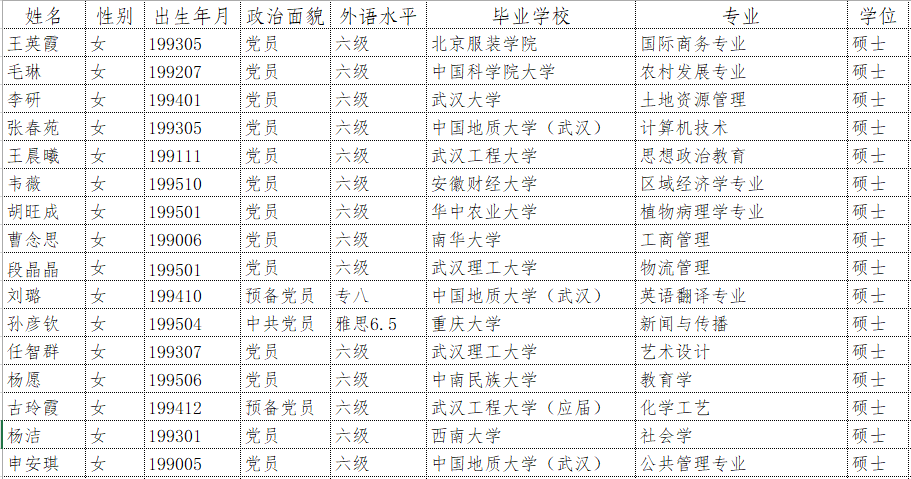 英国365集团网站面向社会公开招聘工作人员已完成对报名人员资格审查,根据优先聘用条件(党员或预备党员+CET6或雅思6.5以上或专业4级以上+硕士)确定参加笔试人员名单如下(排名不分先后):