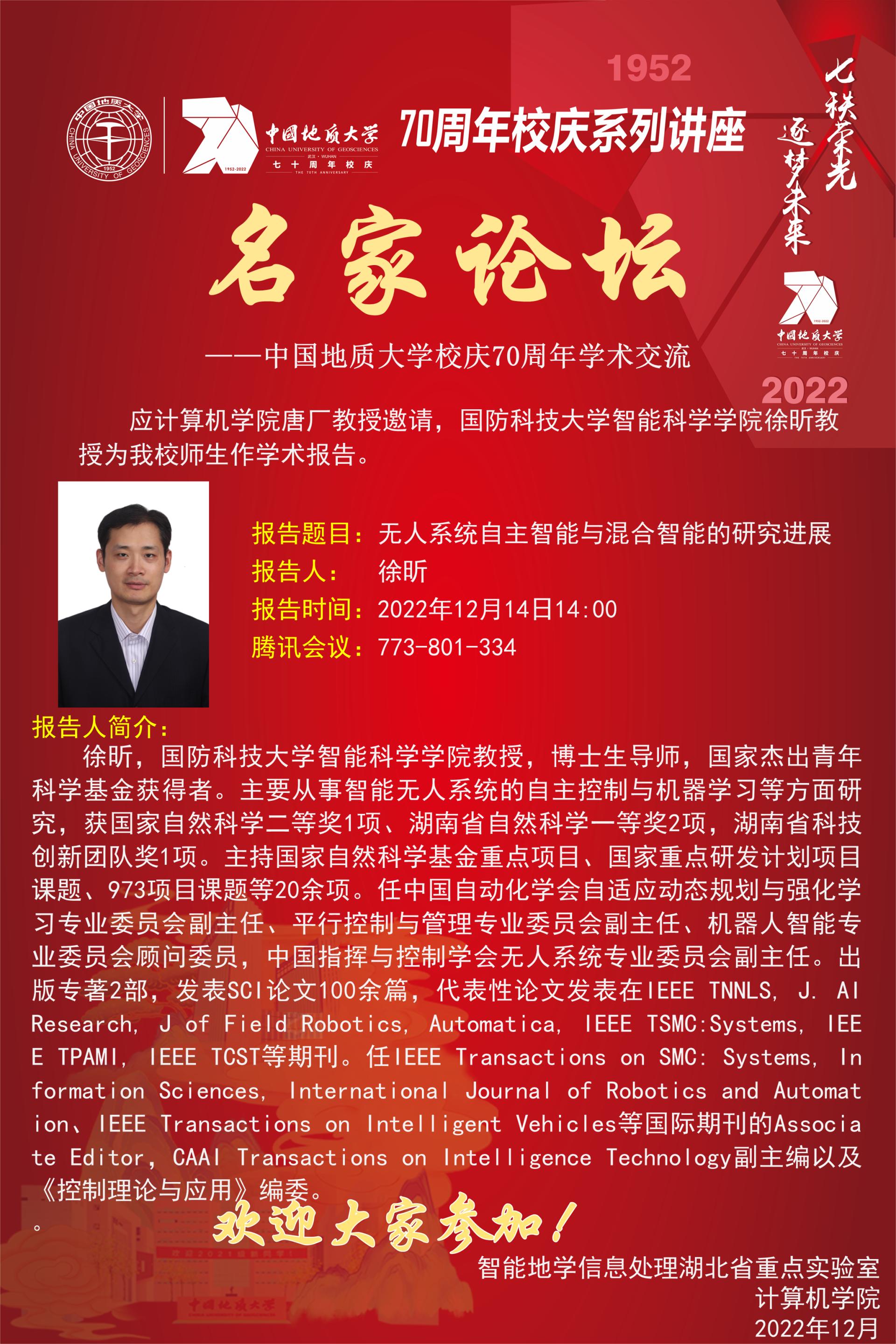 学术报告:国防科技大学智能科学公司徐昕教授——无人系统自主智能与混合智能的研究进展
