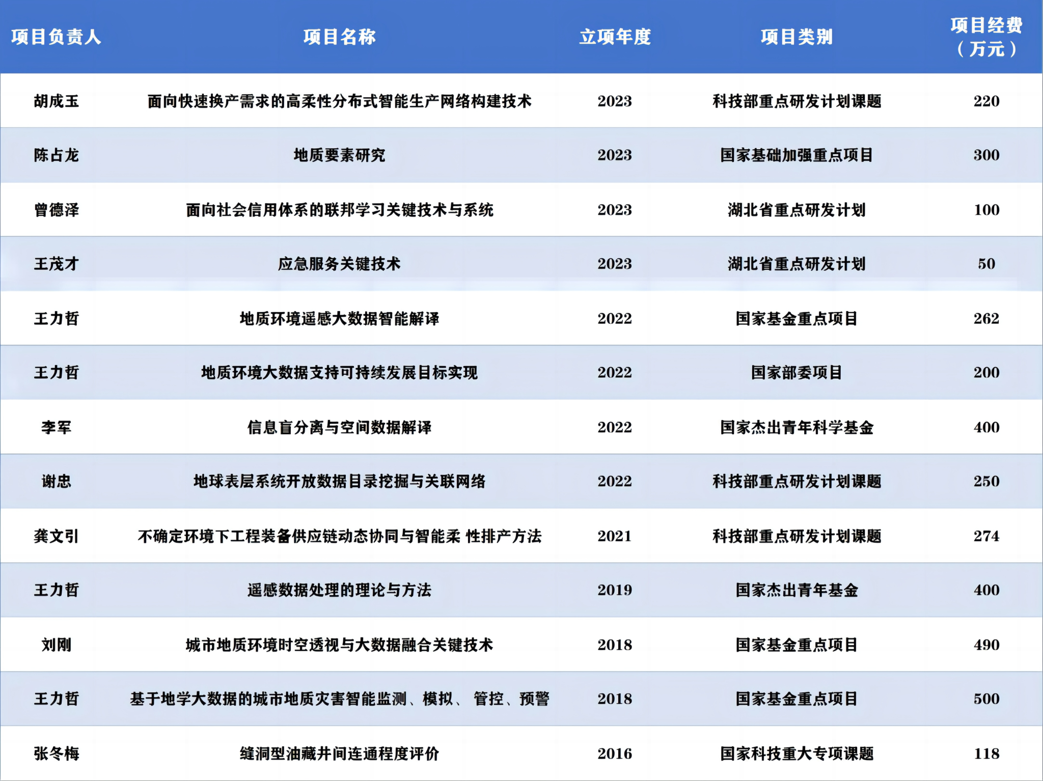 科学研究始终站在计算机学科前沿,围绕计算机科学、人工智能、大数据、高性能计算、信息安全、计算机应用等方向开展创新性研究,服务国家重大战略需求。近5年获得国家重点研发计划、国家科技重大专项和国家自然科学基金等国家级项目资助40余项,项目经费超亿元。研发了自主知识产权的航天任务设计优化与分析仿真软件平台CSTK、地质空间三维可视化软件系统QuantyView、分布式大型地理信息系统软件MapGIS等软件平台,发布了全国首幅1米分辨率土地覆盖专题图SinoLC-1。先后获得国家科技进步奖二等奖4项、省部级科技奖励20余项。