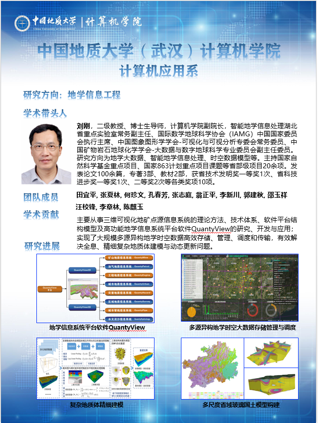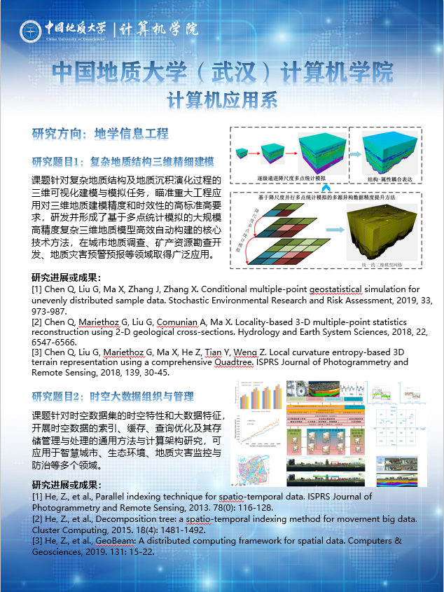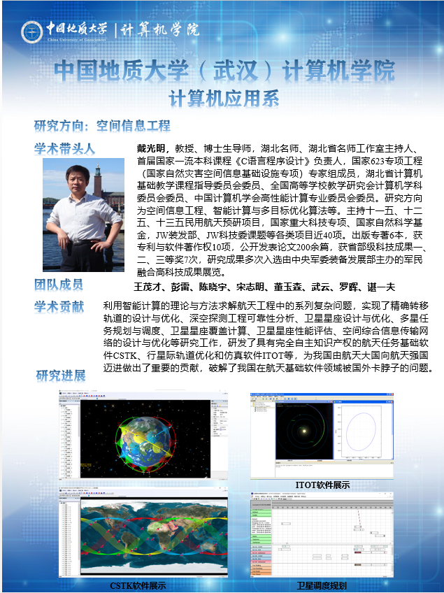 主要开展三维可视化地矿点源信息系统的理论方法、技术体系、高功能地学信息系统平台软件研究、开发与应用,复杂空间信息网络的体系设计、任务规划和推演评估、空间综合信息传输网络的设计与优化,以及遥感影像智能解译等方面的科研工作。在复杂地质结构三维精细建模、时空大数据组织与管理、复杂巨系统体系设计与任务规划、人工智能在航天中的应用、地质信息技术和航天工具基础软件研发等方面形成特色方向。共有专任教师21人,其中学术带头人2人,学术骨干6人;近3年共承担国家和省部级等各类科研项目57项,发表学术论文113篇,出版专著4部,获得省部级以上奖励9项、国家发明专利和软件著作权20项。