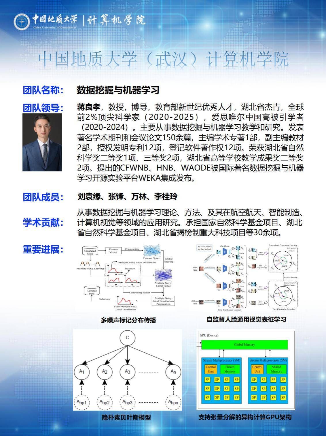 英国365集团网站蒋良孝教授领导的数据挖掘与机器学习团队连续获得国家自然科学基金项目、湖北省自然科学基金重点项目、湖北省揭榜制重大科技项目等资助,自主研发数据挖掘与机器学习系列理论及其应用创新成果,发表著名学术期刊和会议论文500余篇,授权国家发明专利50余项,登记计算机软件著作权30余项,出版教材专著10余部,荣获省部级以上奖励10余项。与国内外同类产品相比,具有高效和鲁棒的特点,目前已经在航空航天、智能制造、计算机视觉等领域推广应用,并获得广泛认可与好评,具有广泛的市场前景和预期经济效益。